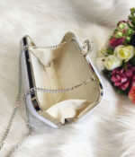 -قاب و زنجیر نقره ای: قاب فلزی نقره ای و زنجیر بلند(که رنگ آن ثابت است و تغییر نمیکند ) به کیف عروس مدل دردانه برند سیندوخت حس لوکس و پایداری میدهد.