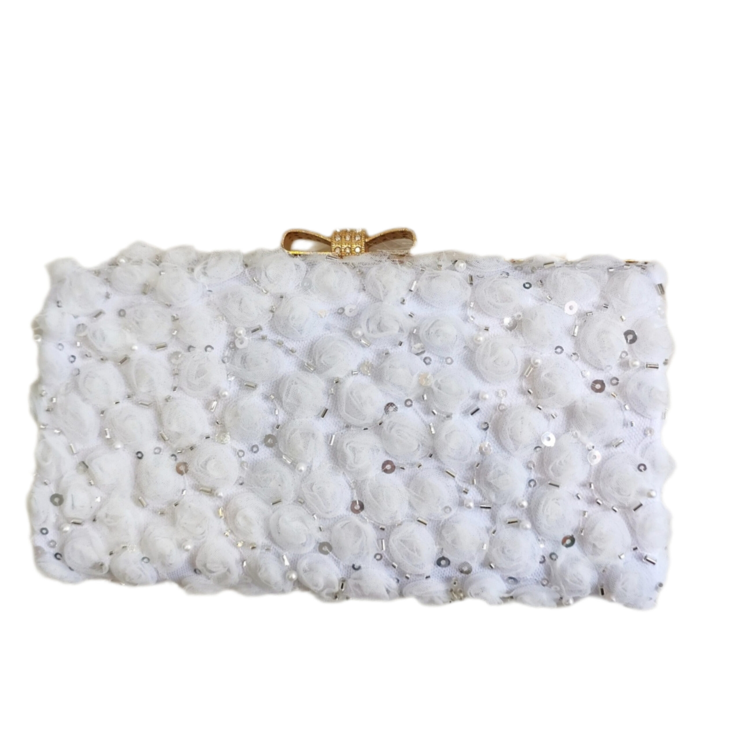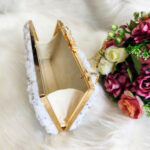 طراحی رویه این کیف عروس مدل گل دانه برند سیندوخت، ترکیبی هنرمندانه از شکوفههای حریر برجسته است که با مرواریدهای ریز و پولکهای کریستالی تزئین شدهاند. این بافتِ سهبعدی و ظریف، هماهنگی بینظیری با گیپور، دانتل یا ساتنِ لباس عروس ایجاد میکند. قفلِ طلایی با طرح *پاپیون نگیندار*، مانند یک تاج کوچک بر بالای کیف قرار گرفته تا در هر زاویهی عکاسی، جلوهای اشرافی داشته باشد.