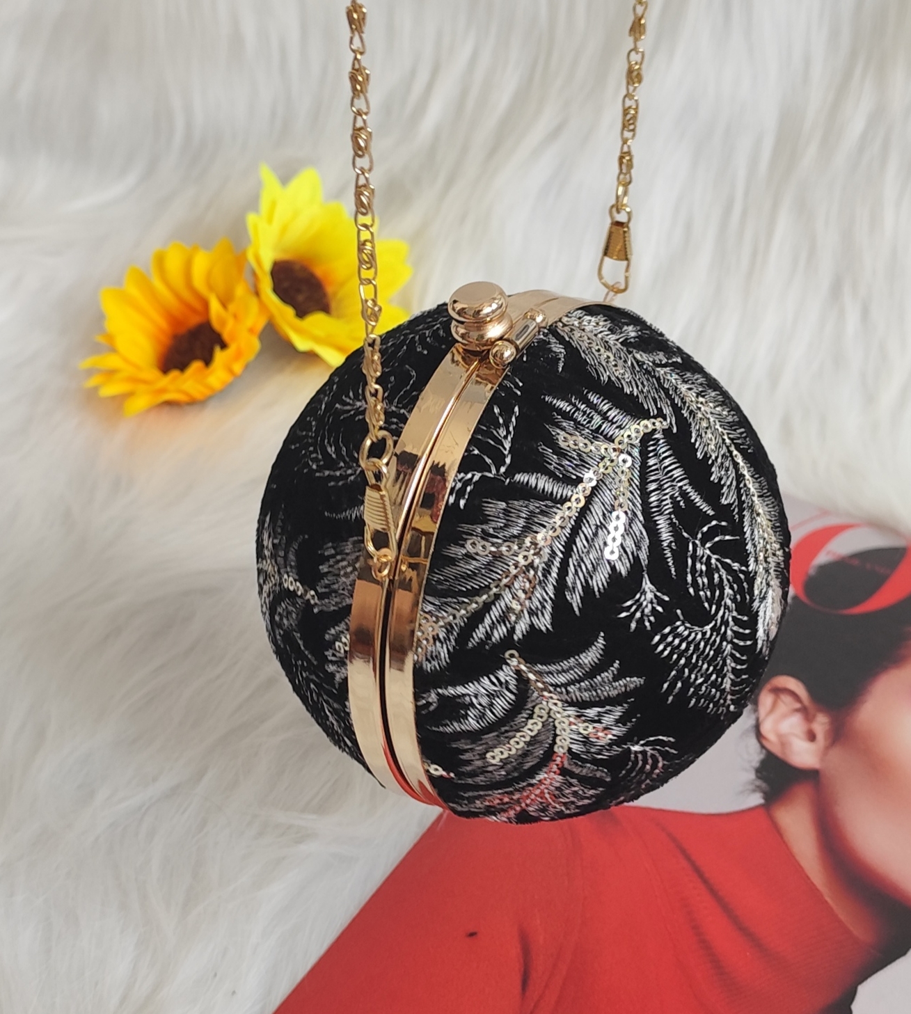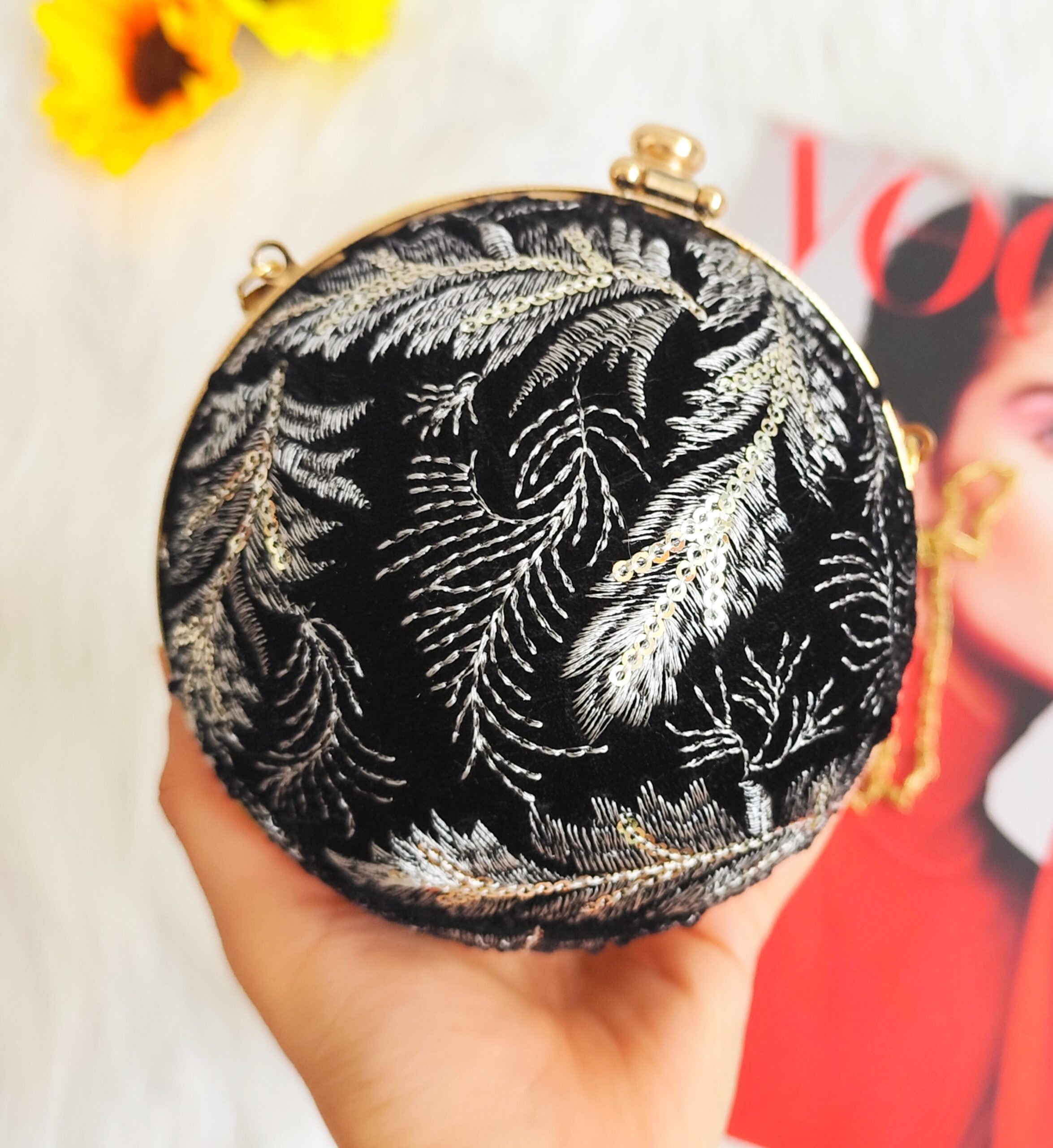 نقش‌ونگارهای روی این کیف مجلسی زنانه مدل سایه برند سیندوخت با الهام از طرح‌های اسلیمی و گیاهی دوخته شده‌اند که تضاد زیبایی با رنگ مشکی بدنه ایجاد می‌کنند. فرم گرد این کیف، تکرار کلیشه‌های مستطیلی را می‌شکند و به شما استایلی متفاوت و جسورانه می‌دهد.