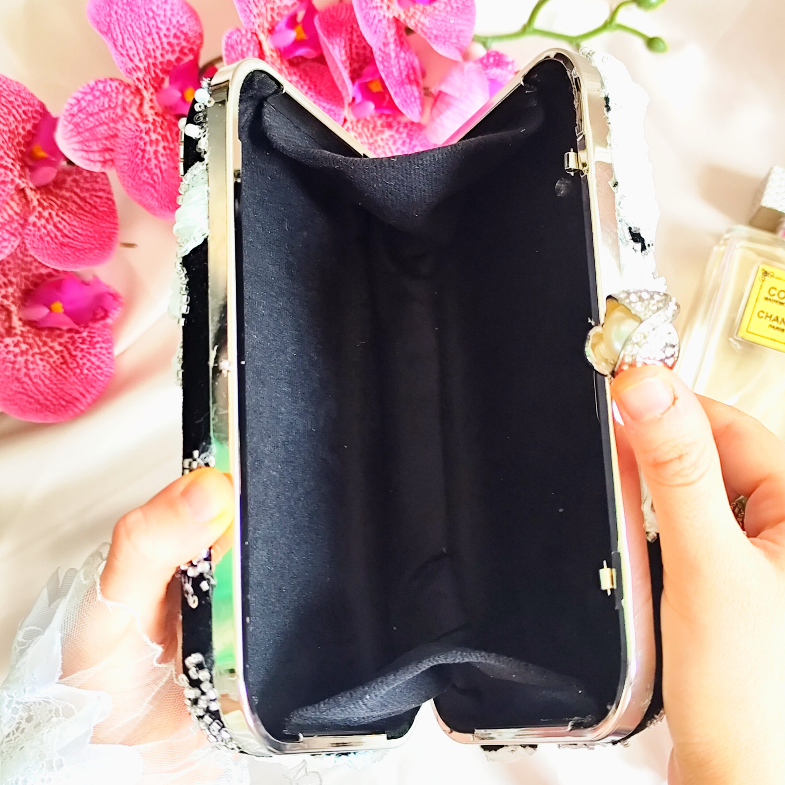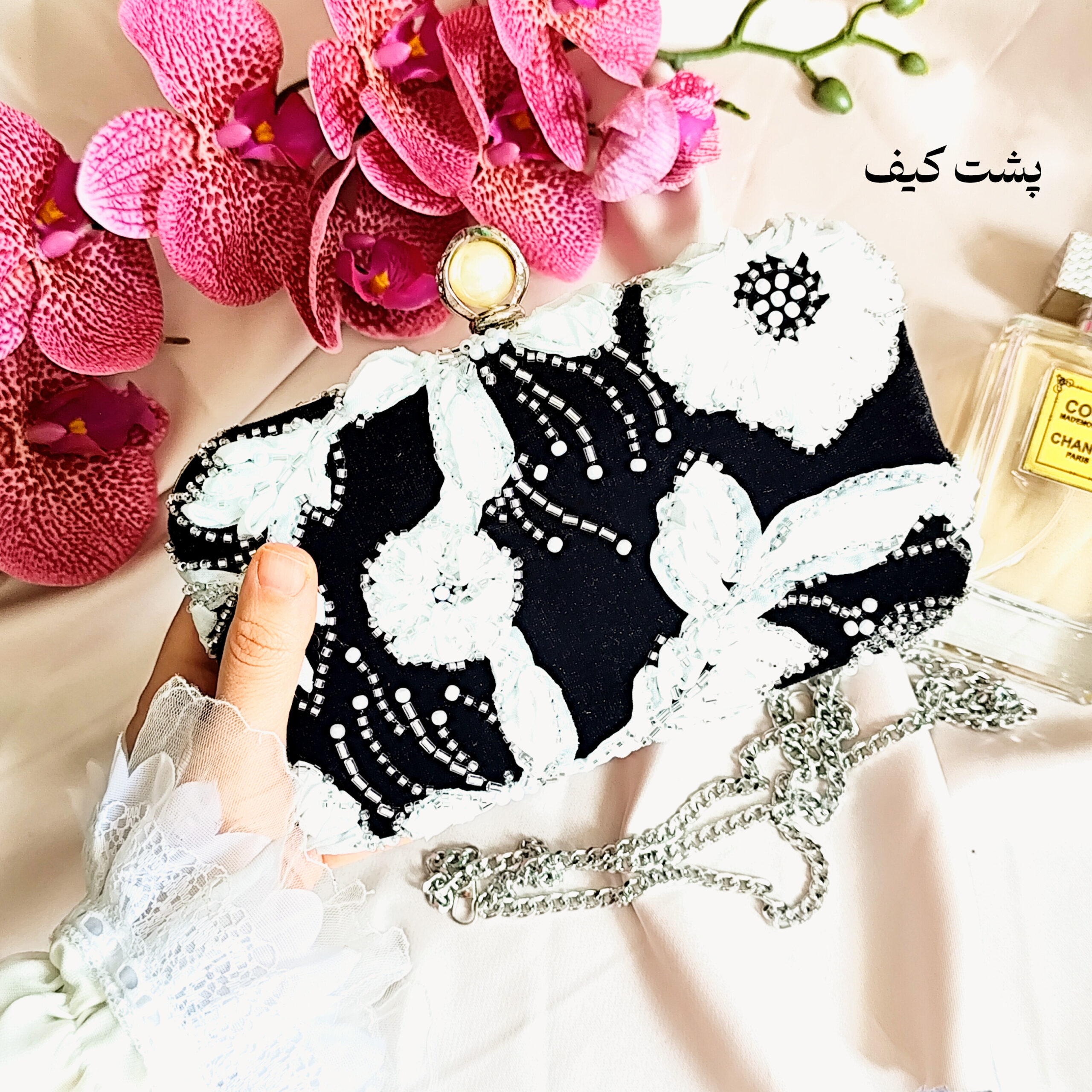 – جزئیات: تزئین شده با مروارید در قسمت قفل و گل‌های برجسته دست‌دوز.